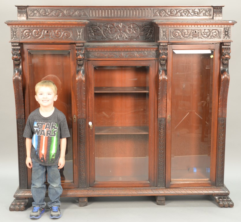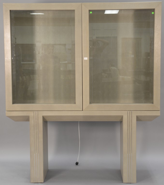 Karl Springer lizard veneer breakfront in two parts having two bevel glass doors with eight 1 thick glass shelves, all on modern base of two legs, signed Karl Springer 1988. ht. 84 in. wd. 72 in. dp. 18 in.