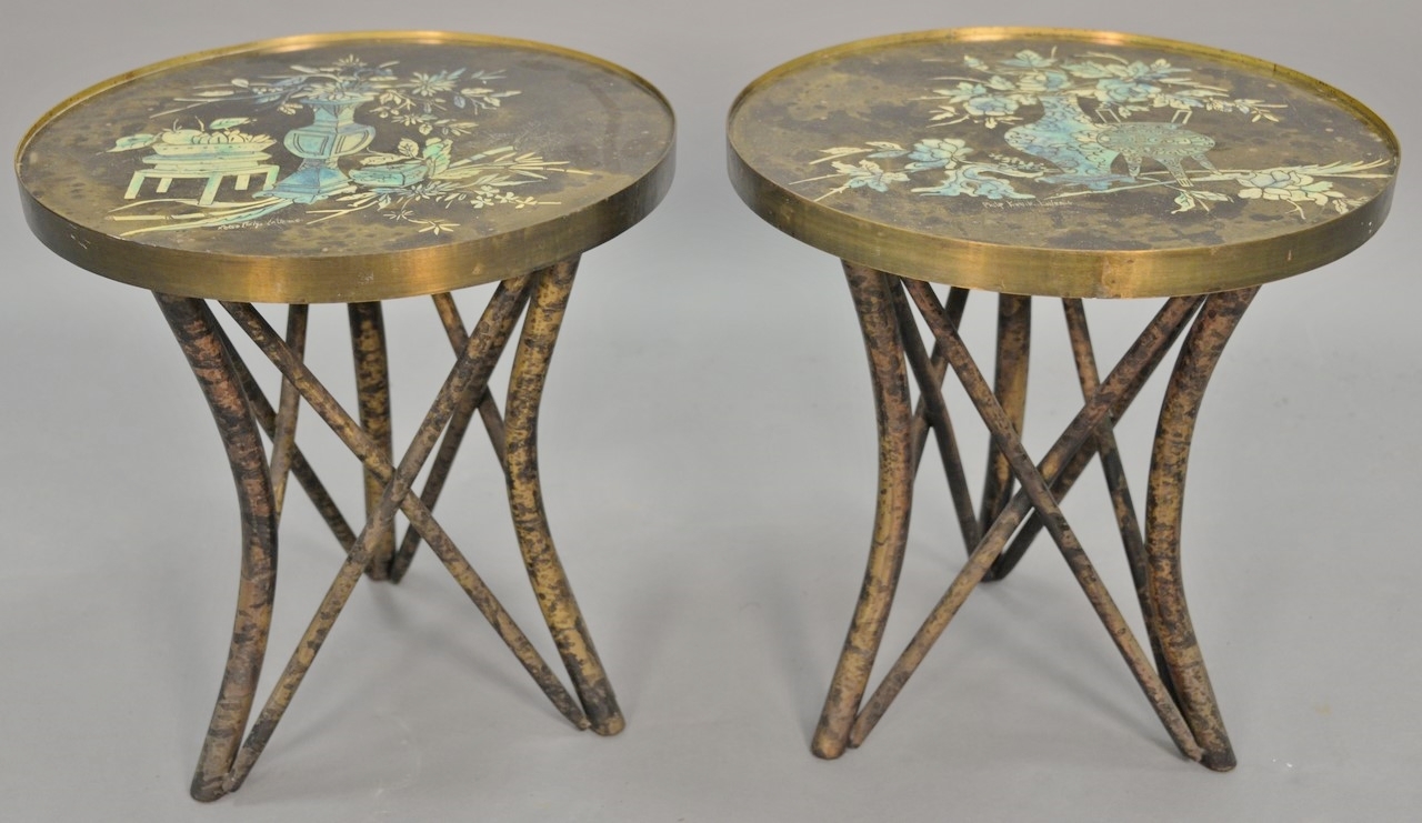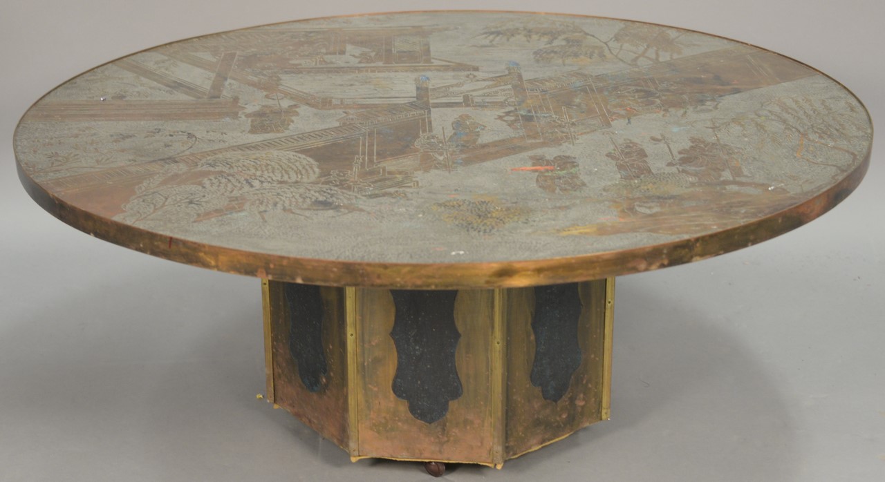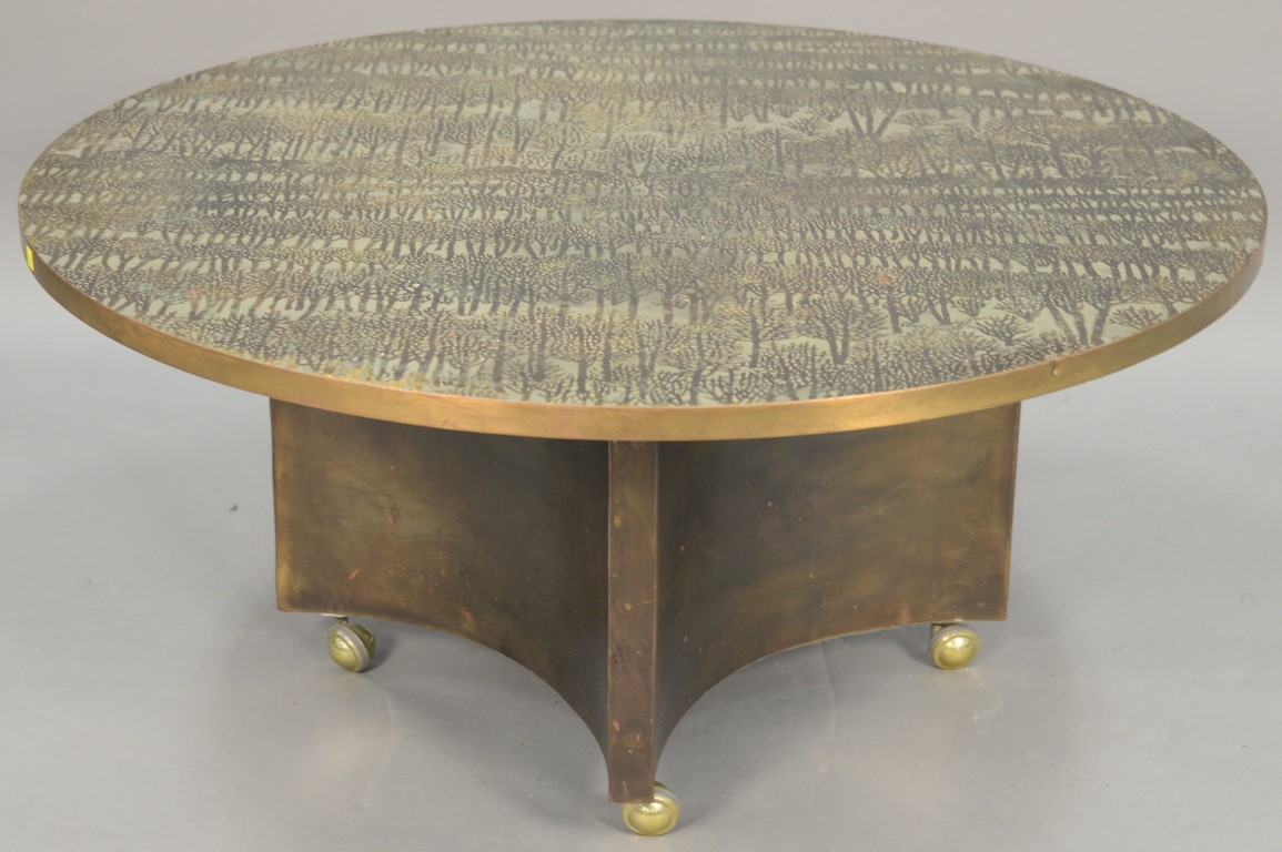 Philip and Kelvin Laverne Eternal Forest coffee table, acid-etched and enameled patinated brass and pewter clad, signed: Philip Kelvin Laverne. ht. 19 in. dia. 41 3/4 in.