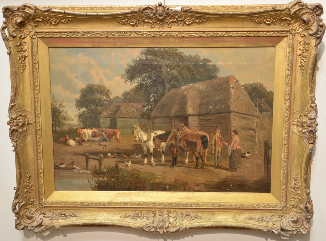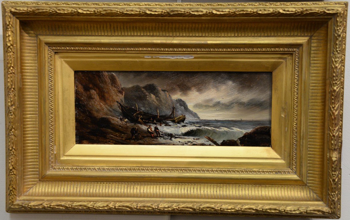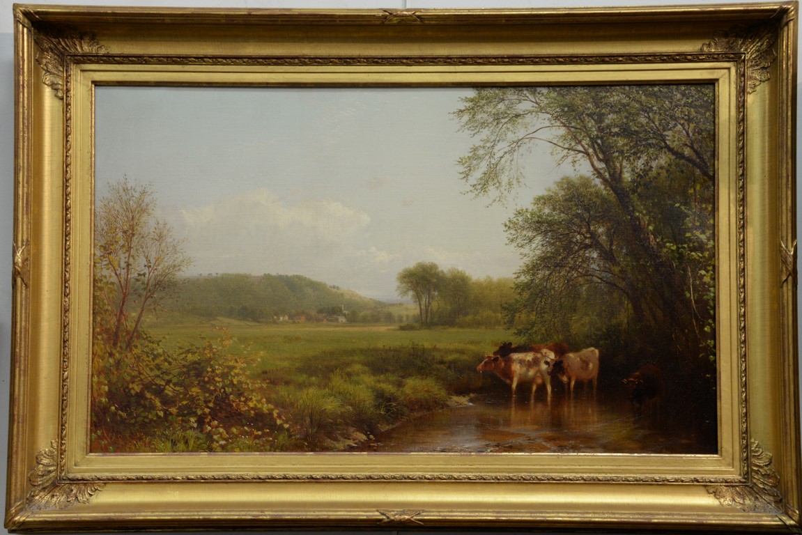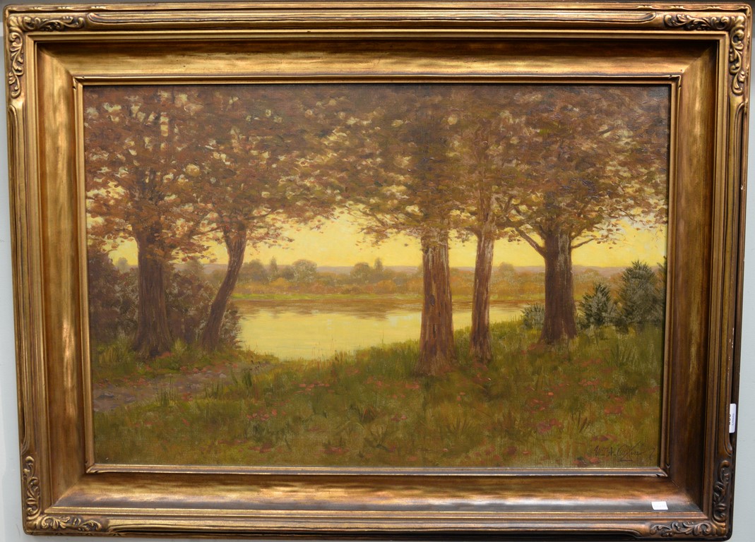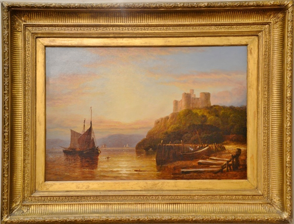 Oil on Canvas Sun Setting with Castle Overlooking Water’s Edge unsigned relined in Victorian frame 24 x 36 Provenance: Property from Credit Suisse’s Americana Collection