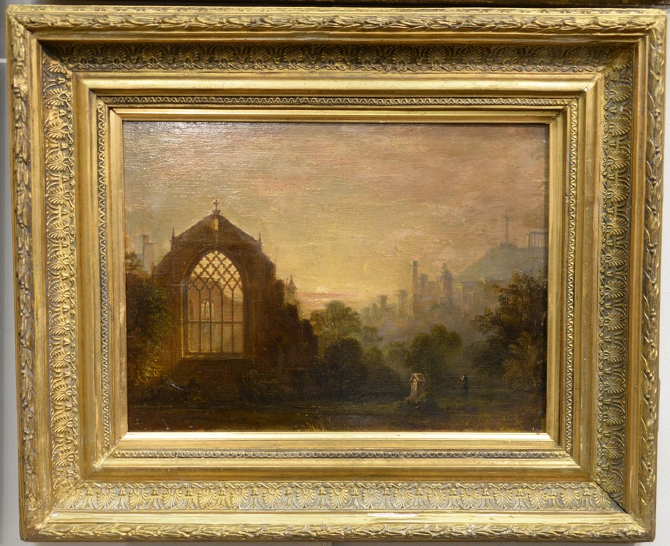 19th Century Painting European Landscape background with castles and foreground with church oil on board unsigned 9 x 12 1/2 Provenance: Property from Credit Suisse’s Americana Collection