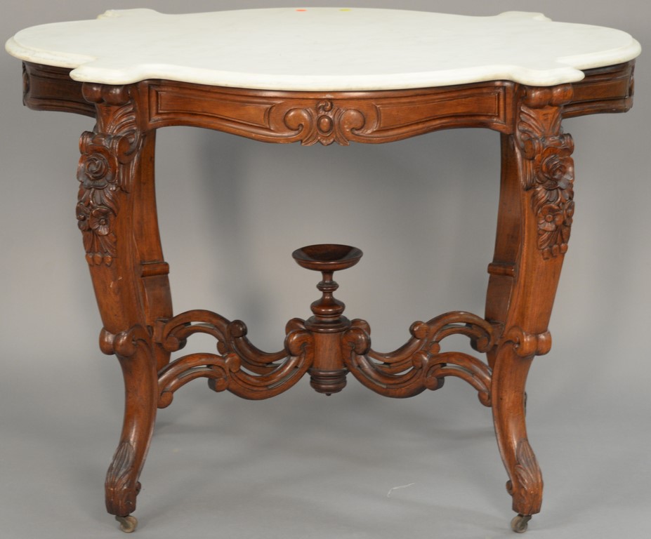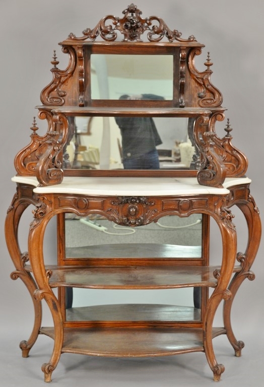 Rosewood Victorian etagere having pierce carved top with two shelves having mirrored backs set on carved supports resting on a base with shaped marble top and carved cabriole legs, base with two shelves having mirrored backs, circa 1860. ht. 75in. wd. 55in. dp. 22in.