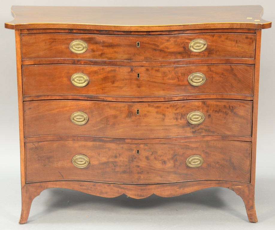 George III mahogany serpentine chest of four drawers set on French feet, circa 1790-1810. ht. 34in. wd. 45in. dp. 22in. Provenance: The Estate of Natalie Rafferty
