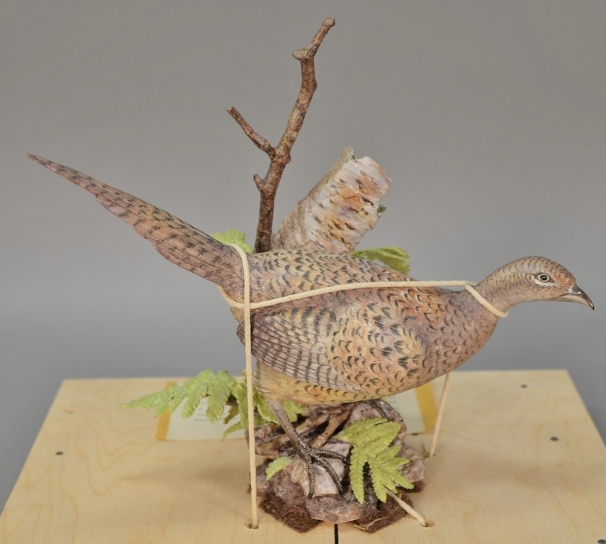 Two Royal Worcester LTD Ed. Van Ruyckevelt pheasants, a hen and a cock with ring neck, in original crate and in box, still tied down, along with wood bases. hen: ht. 12 in. lg. 13 in. cock: ht. 12 in. lg. 19 in.