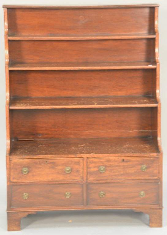 George III mahogany and pine bookshelf with two drawers and two false drawers top right molding missing, scratches on shelves.