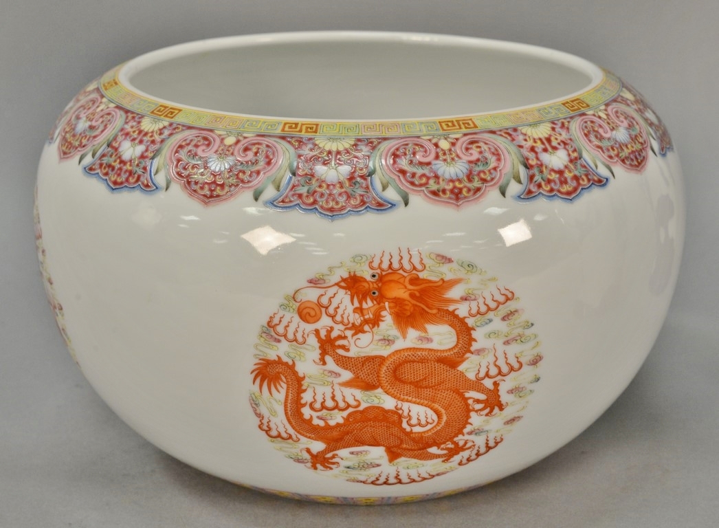 Chinese porcelain bowl, Guangxu 1875-1908 mark and period, decorated with five clawed dragons in iron red and borders in famille rose enamels, six character reign mark in iron red on base. ht. 6 in. opening dia. 7 in.