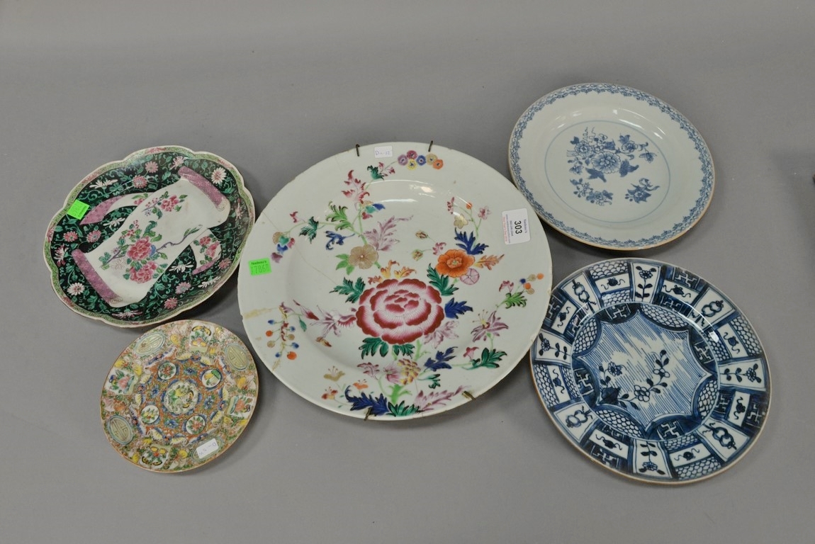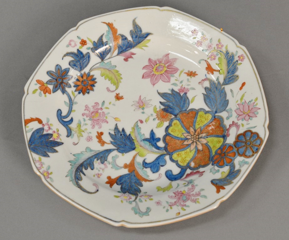 Set of twelve Chinese Export Pseudo Tobacco Leaf plate with scalloped edge and enamels of pink, yellow, iron-red, and green with overall blossoms, lotus flowers, scrolling vines, and leaves, 18th century. dia. 9 in.
