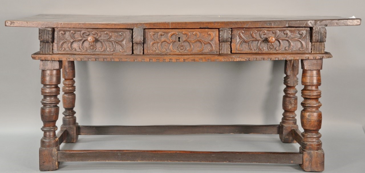 Refectory table with single board slab top over carved drawers set on block and turned legs with box stretcher, probably 17th century minor restorations. ht. 31 in. top: 25 1/2 x 69