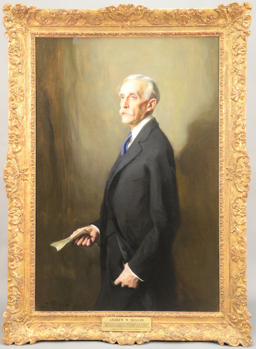 Philip A. deLaszlo 1869-1937 3/4 length portrait of Andrew William Mellon 1855-1937 oil on canvas, painted from life in 1926 signed and dated lower left: deLaszlo 1926 March plaque: Andrew W. Mellon, Presented to the Chamber of Commerce of the State of New York by four hundred and seventy three members in recognition of the ability, efficiency and far sighted policies shown by Mr. Mellon as Secretary of the Treasury of the United States, Painted in 1926 by Philip A. De Laszlo 52 x 36 Mellon was the United States Secretary of the Treasury 1921-1932 resigned, the Ambassador to the Court of St. James, and the Director of the Pittsburgh National Bank of Commerce. Provenance: Property from Credit Suisse’s Americana Collection