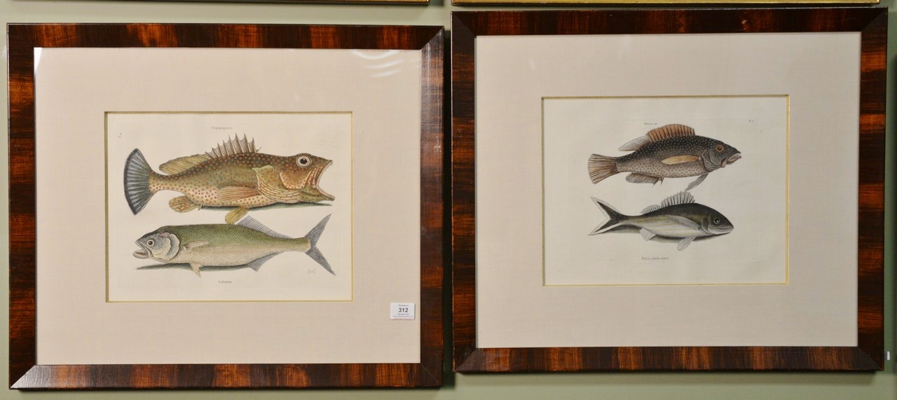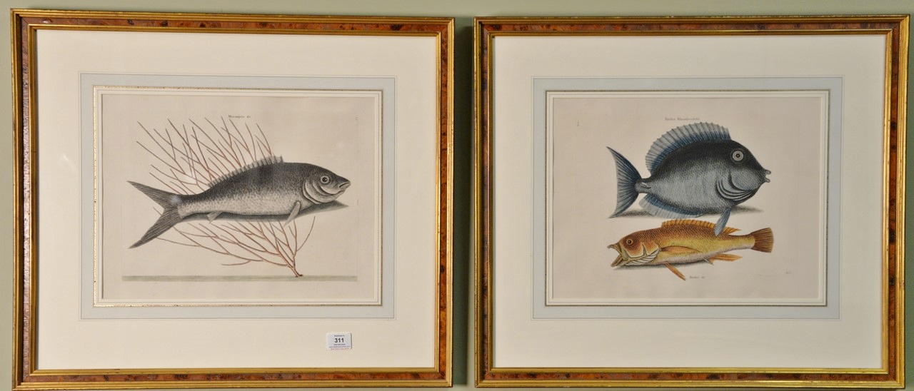 Mark Catesby 1679-1749 pair of hand colored copper plate engravings The Hind Ccugupuguacua, The SkipJack Saltatrix Plate #14 and The Negro Fish Pesca Perca, The Black-Tail Cauda Nigra Plate #7 From The Natural History of Carolina, Florida and the Bahama Islands framed by W. Graham Arader III sight size: 11 1/2 x 15 Provenance: Property from Credit Suisse’s Americana Collection