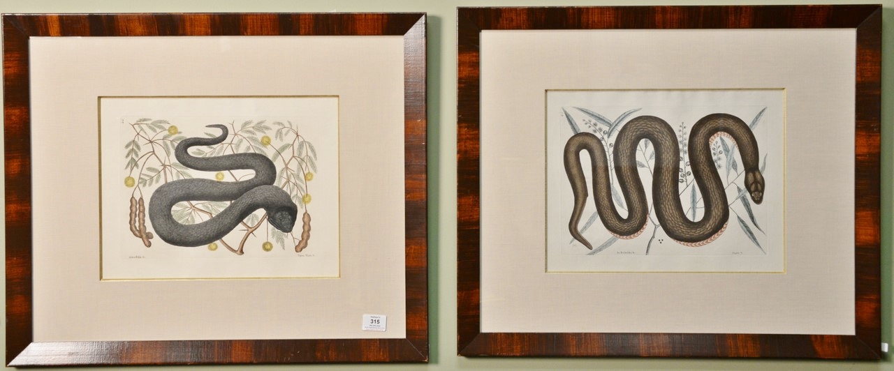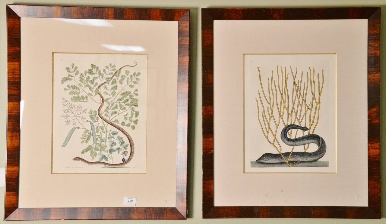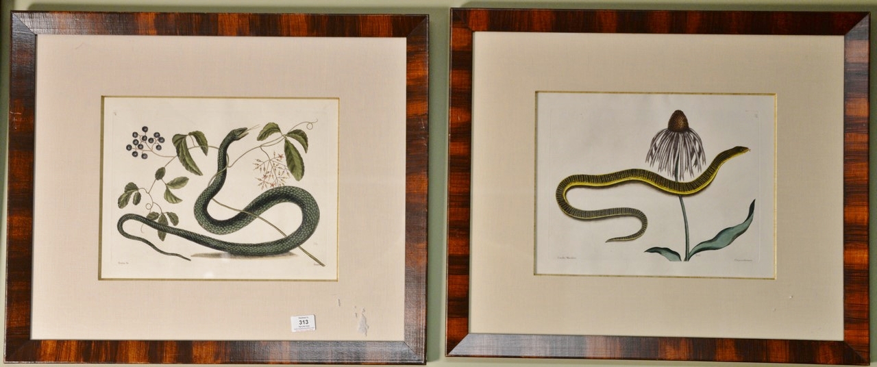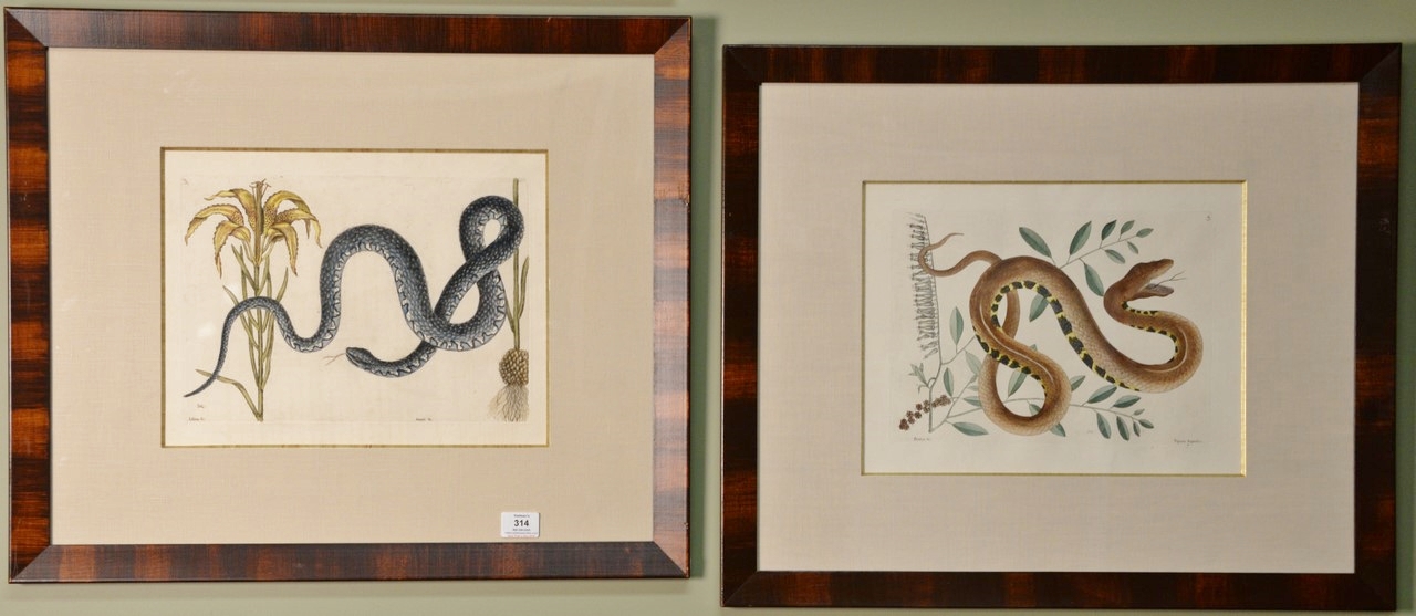 Mark Catesby 1679-1749 pair of hand colored copper plate engravings Lilium Snake Anguis Plate #58 and The Water Viper Vipera Aquatica Plate #43 From The Natural History of Carolina, Florida and the Bahama Islands framed by W. Graham Arader III sight size: 11 1/2 x 15 Provenance: Property from Credit Suisse’s Americana Collection