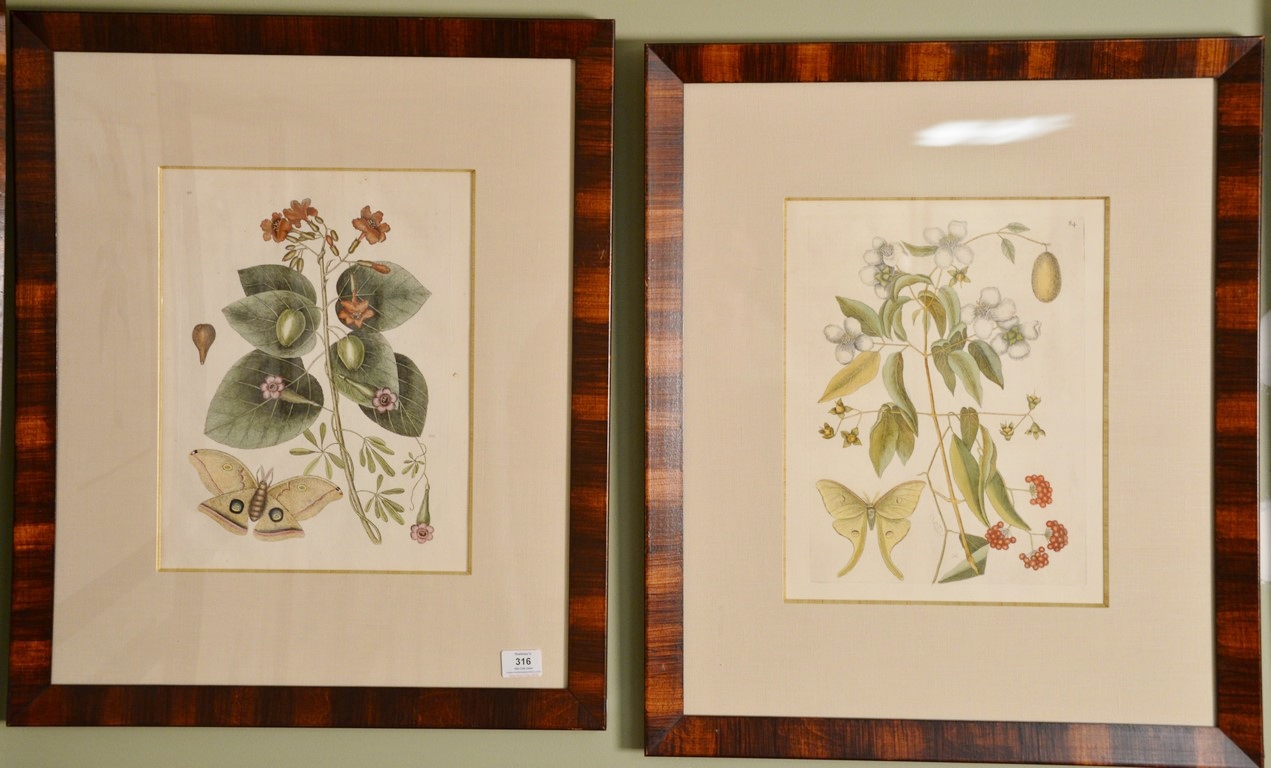 Mark Catesby 1679-1749 pair of hand colored copper plate engravings The Great Moth Phalaena Plate #91 and The Four Eye’d Night Butterfly Plate #84 From The Natural History of Carolina, Florida and the Bahama Islands framed by W. Graham Arader III sight size: 15 x 11 1/2 Provenance: Property from Credit Suisse’s Americana Collection