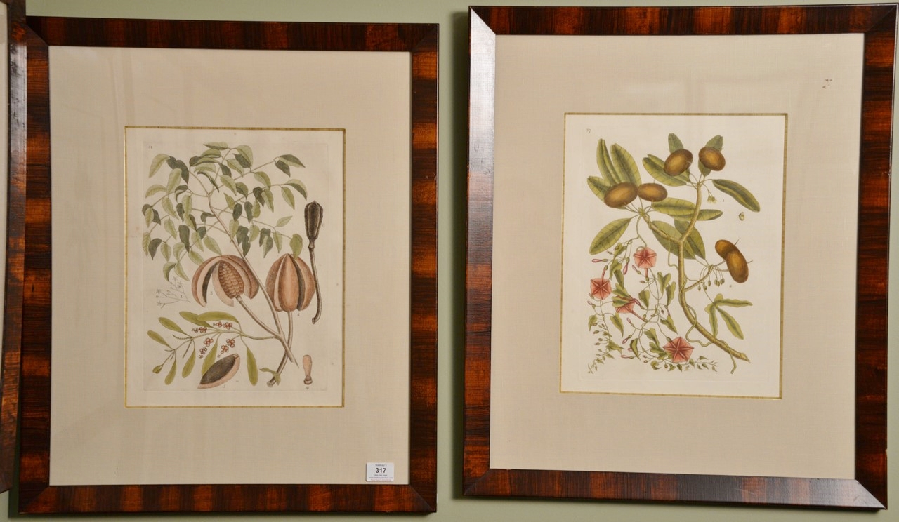 Mark Catesby 1679-1749 pair of hand colored copper plate engravings The Mahogany Tree Arbor Folis Pinnatis Plate #81 and The Sappadillo Tree Anona Folis Laurinis Plate #87 From The Natural History of Carolina, Florida and the Bahama Islands framed by W. Graham Arader III sight size: 15 x 11 1/2 Provenance: Property from Credit Suisse’s Americana Collection