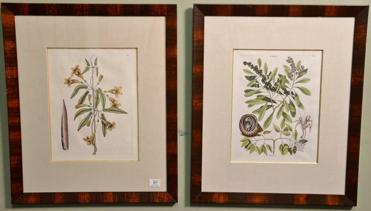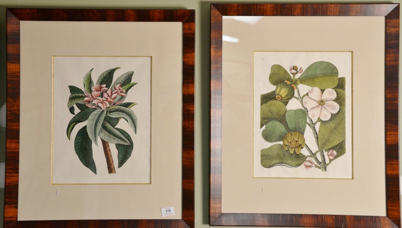 Mark Catesby 1679-1749 pair of hand colored copper plate engravings The Balsam Tree Cenchramidea Arbor Faxis Plate #99 and Plumeria Flore Roseo Odoratissimo Plate #92 From The Natural History of Carolina, Florida and the Bahama Islands Second Edition London 1754 framed by W. Graham Arader III sight size: 15 x 11 1/2 Provenance: Property from Credit Suisse’s Americana Collection
