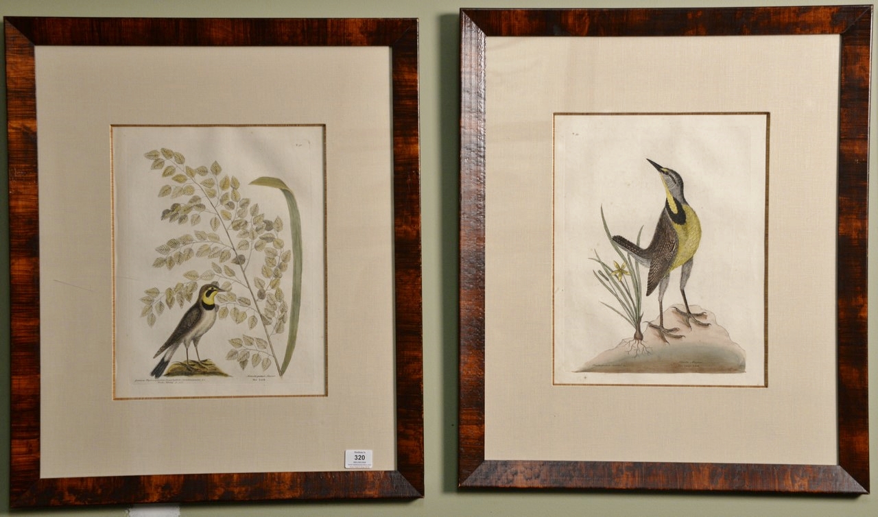 After Mark Catesby 1679-1749 pair of hand colored copper plate engravings The Large Lark, Alauda Magna Plate #T33 and The Lark, Alauda Gutture Flavo Plate #T32 From The Natural History of Carolina, Florida and the Bahama Islands framed by W. Graham Arader III sight size: 15 x 11 1/2 Provenance: Property from Credit Suisse’s Americana Collection