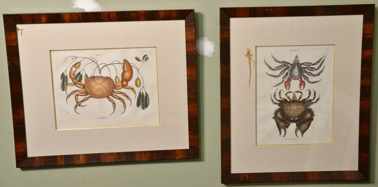 Mark Catesby 1679-1749 set of four of hand colored copper plate engravings The Hermit Crab Cancellus Maximus Plate #34 The Land Crab Cancer Terreftris Plate # 32 The Red Claw Crab Cancer Chelis Rubris Plate #37 and The Red Motted Rock Crab Pagurus Maculatus and The Rough-Shelled Crab Cancer Chelis Crassisimus Plate #36 From The Natural History of Carolina, Florida and the Bahama Islands framed by W. Graham Arader III sight size: 15 x 11 1/2 Provenance: Property from Credit Suisse’s Americana Collection