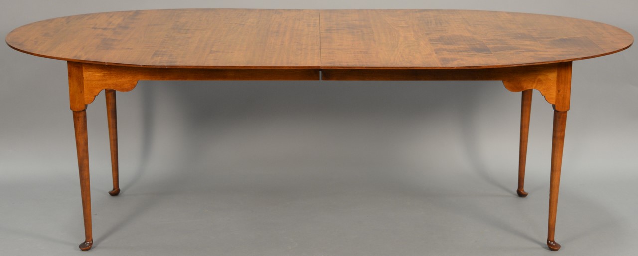 D. R. Dimes custom tiger maple dining table, Queen Anne style oval with two leaves, signed with paper label. ht. 29 1/2in. closed: 90 x 40 3/4 open: 126 x 40 3/4