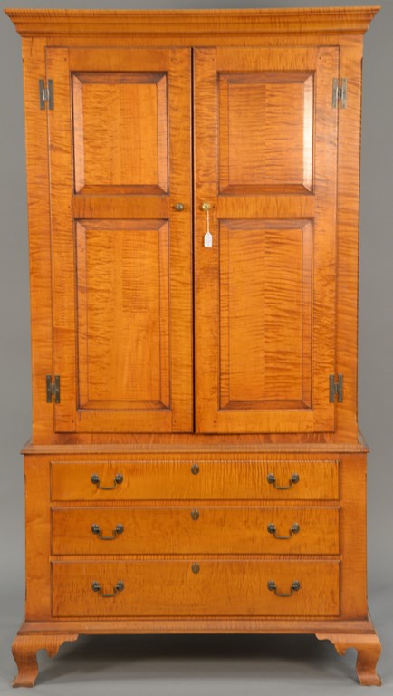 Eldred Wheeler tiger maple cabinet in two parts, upper section with two doors on base with three drawers, all set on bracket feet, signed on drawer. ht. 81 in. wd. 40 in. dp. 25 1/2 in.