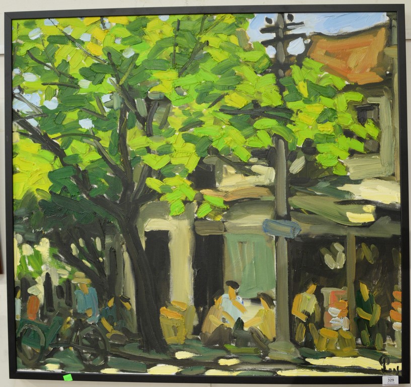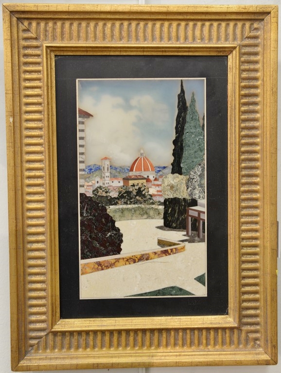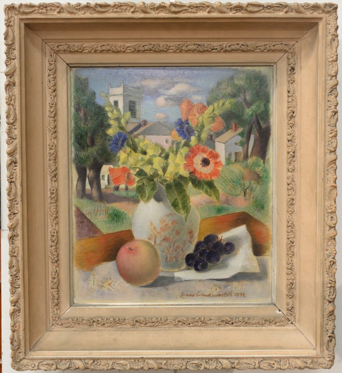 Simka Simkhovitch 1893-1949 Still Life of Flowers with Town in background oil on artist board signed and dated lower right: Simka Simkhovitch 1933 13 x 11 Provenance: The Estate of Natalie Rafferty