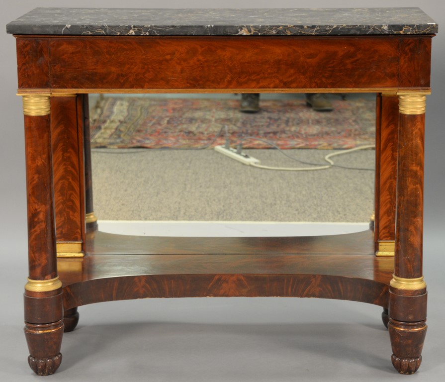 Classical mahogany pier table having grey marble top on base with gilt bronze mounted columns, mirror back with carved and turned feet, circa 1840. ht. 36 1/2 in. wd. 42 in. dp. 18 in. Provenance: Property from Credit Suisse’s Americana Collection