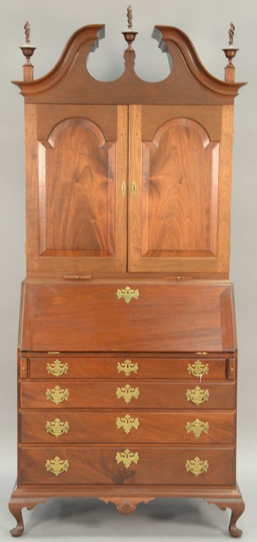 R. H. Effinger custom made Chippendale style mahogany secretary desk in two parts, upper section with full bonnet top over two raised panel doors opening to reveal adjustable shelves and five drawers set on lower section having slant lid over four drawers, all set on brandy legs, interior all shell carved with six small drawers above letter holders, made by R. H. Effinger Fryburg, ME, 20th century copy of Massachusettes desk.