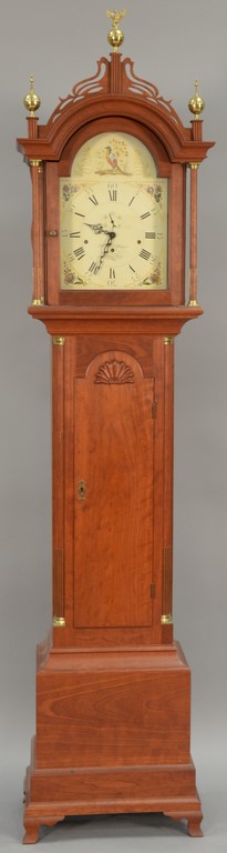 R. H. Effinger cherry tall case clock having shell carved door flanked by brass stop fluted quarter columns, all set on ogee feet, brass works with chimes and painted porcelain dial marked R.H. Effinger, Fryburg, ME, 20th century. ht. 90in. wd. 20in.