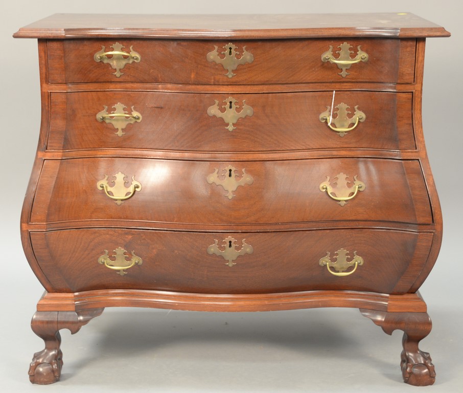 Effinger custom mahogany four drawer chest, Bombay form with shaped top over conforming case set on ball and claw feet by R.H. Effinger, Fryberg Me.