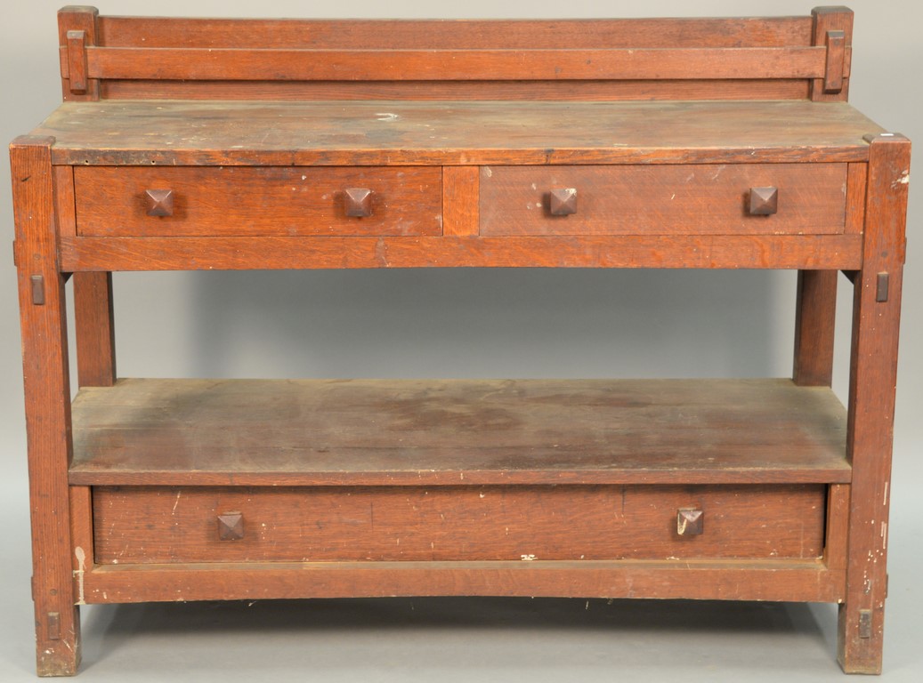 Gustave Stickley mission oak sideboard having plate rail back over two drawers over shelf with one drawer all set on squared legs, back having red tool mark of Gustav Stickley, circa 1920, original finish two drilled holes on top left, some stains.