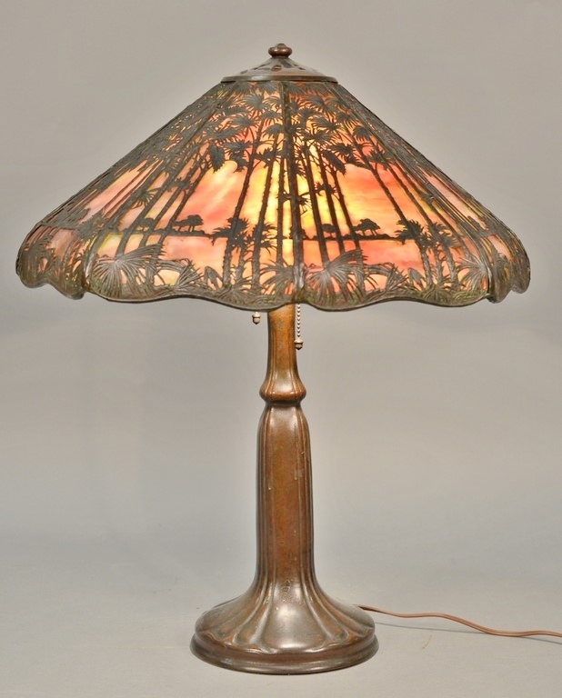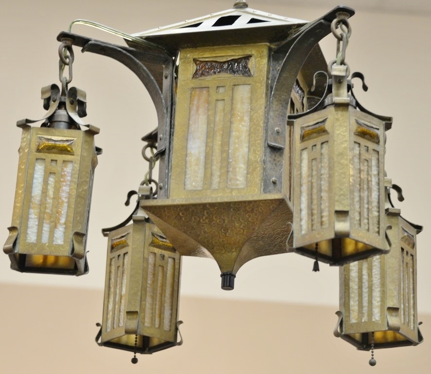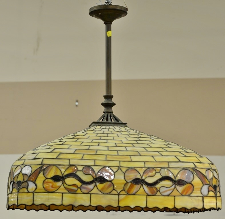 Handel large square hanging light, leaded shade with yellow body and leaf border having bronze three light stem, marked 80-1903-21 Handel. ht. 28 in. dia. of shade 23 1/2in.