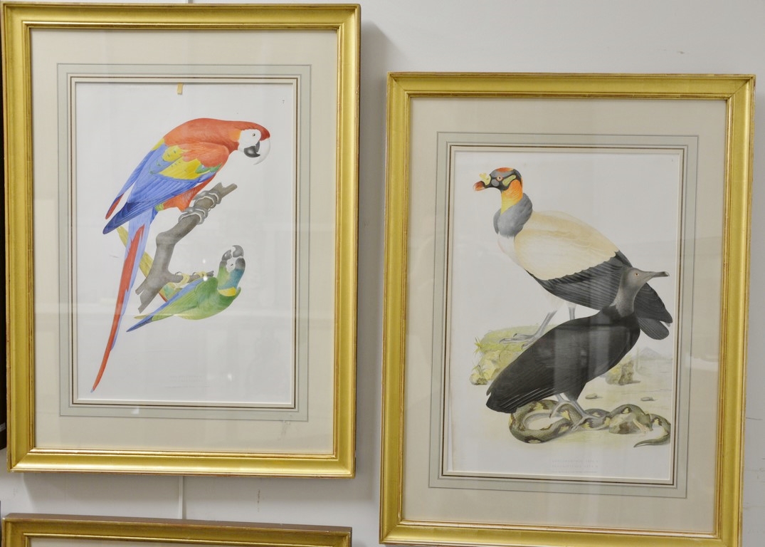 Set of Four After Jean Theodore Descourtilz 1796-1855 four large folio chromolithograph and finished by hand Ara Aracanga Cryssosema, plate 7 Sarcoramphus Papa, Percnopterus Jota, plate 1 Morphnus Braccatus, plate 3 Turdus Rufiventer, plate 26 all printed by Waterlow & Sons Chromo-Lithographers, from Ornithologie Bresilienne, ou Histoire des oiseaux dubresil sight size: 23 1/2 x 16 Provenance: Property from Credit Suisse’s Americana Collection