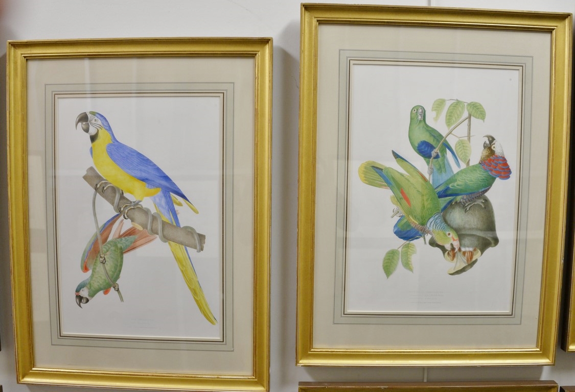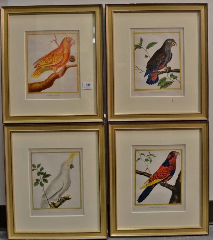 Set of four Francois Nicolas Martinet 1725-1804 hand colored engravings Perruche, des Indes Orientales Petit Kakatoes a hupe Jaune Perroquet Varie, de Cayenne and Perroquet, de Cuba sight size: 10 x 8 Provenance: Property from Credit Suisse’s Americana Collection