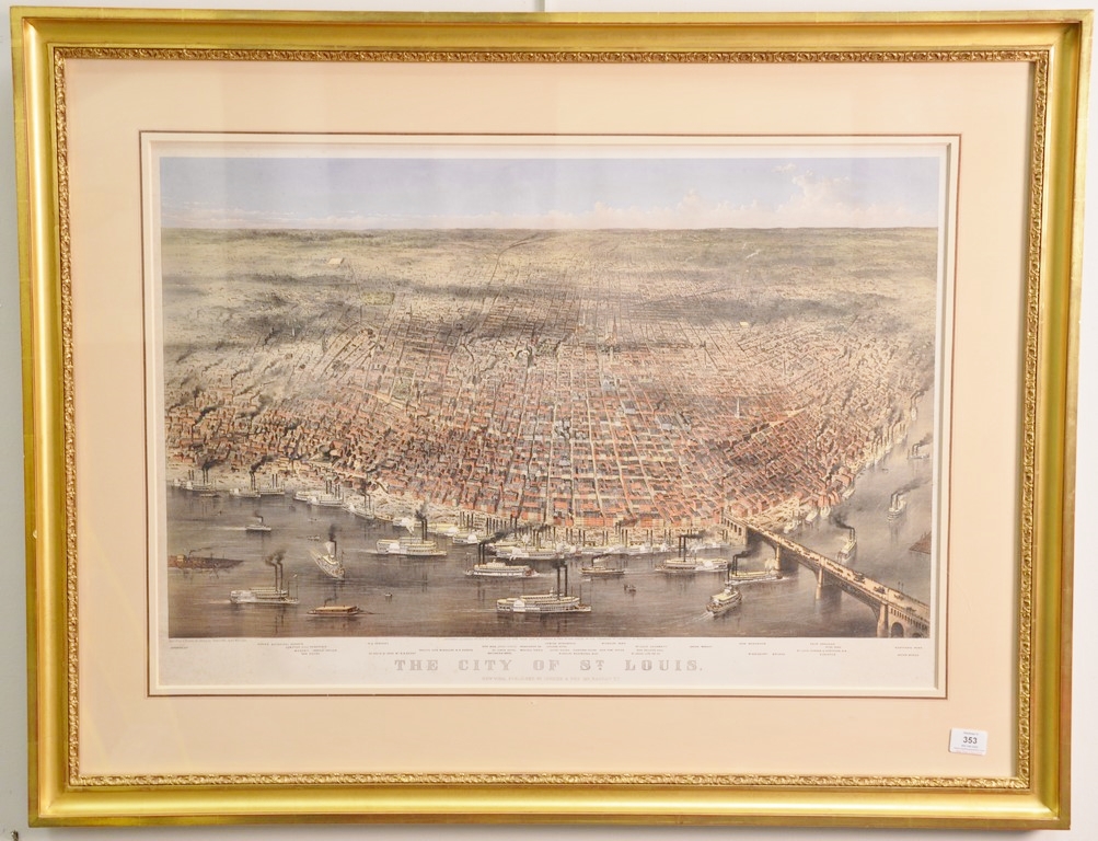 Currier & Ives 1874 After Charles R. Parsons & Lyman Atwater The City of St. Louis hand colored lithograph marked bottom center: New York, Published by Currier & Ives 125 Nassau St. sight size: 23 x 33 Provenance: Property from Credit Suisse’s Americana Collection