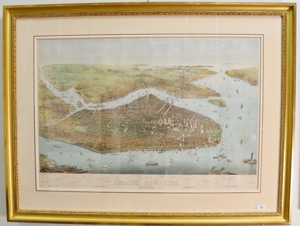 Joseph Koehler The City of Greater New York colored lithograph marked lower left: Lith of Charles Hart, N.Y. marked lower right: Copyright 1905 by Joseph Koehler, N.Y. sight size: 26 x 38 Provenance: Property from Credit Suisse’s Americana Collection