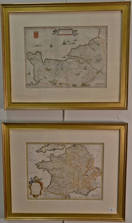Two double page hand colored engraved maps Nova Et Esatta Tavola de Regno di Francia….Gio. Iacomo de Rossi in Roma alla Pace….Anno 1676 sight size: 15 3/4 x 20 1/4 and Normandia Dvcatvs Excudis Guilelmus Blaeu sight size: 15 x 20 1/2 Provenance: Property from Credit Suisse’s Americana Collection