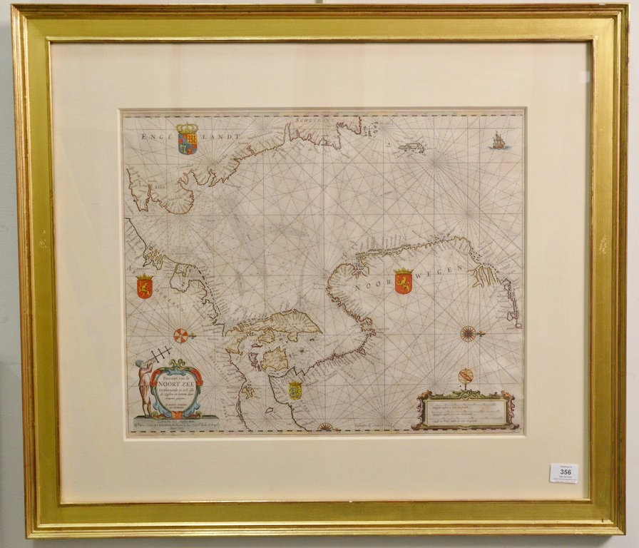 Hand colored engraving map Pascaart van de Noort Zee Verthoonende in Zich alle de Custen en Havens Daer Rontom Gelegen by Pieter Goos, op’t Water in De Vergulde Zee Spiegel by de Ni Brugh Anno 1666 sight size: 17 3/4 x 21 1/2 Provenance: Property from Credit Suisse’s Americana Collection
