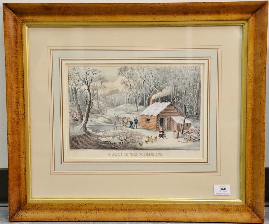 Currier & Ives A Home in the Wilderness hand colored lithograph published by Currier & Ives, 152 Nassau Street, New York 1870 small folio matted and framed in birds eye maple frame sight size: 9 x 13 Provenance: Property from Credit Suisse’s Americana Collection