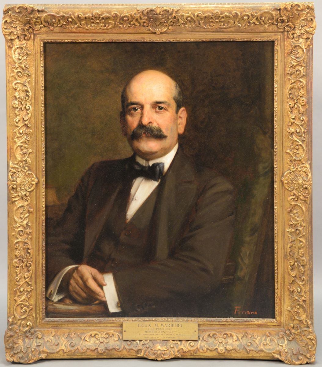 Arthur de Ferraris 1856-c.1928 Portrait of Felix Moritz Warburg 1871-1937 oil on canvas, painted from life in 1922 signed, lower right: Ferraris. Plaque: Felix M. Warburg, Vice President Member 1897-1937, painted from life by Ferraris 1920, Presented by Mrs. Warburg canvas size 30 x 25, total size 37 1/2 x 32 1/2 American frame, circa 1915-1920. Warburg was a Banker and a Sr. Partner in Kuhn, Loeb and Company, he was also a Leader of the American Jewish Joint Distribution Committee. Provenance: Property from Credit Suisse’s Americana Collection
