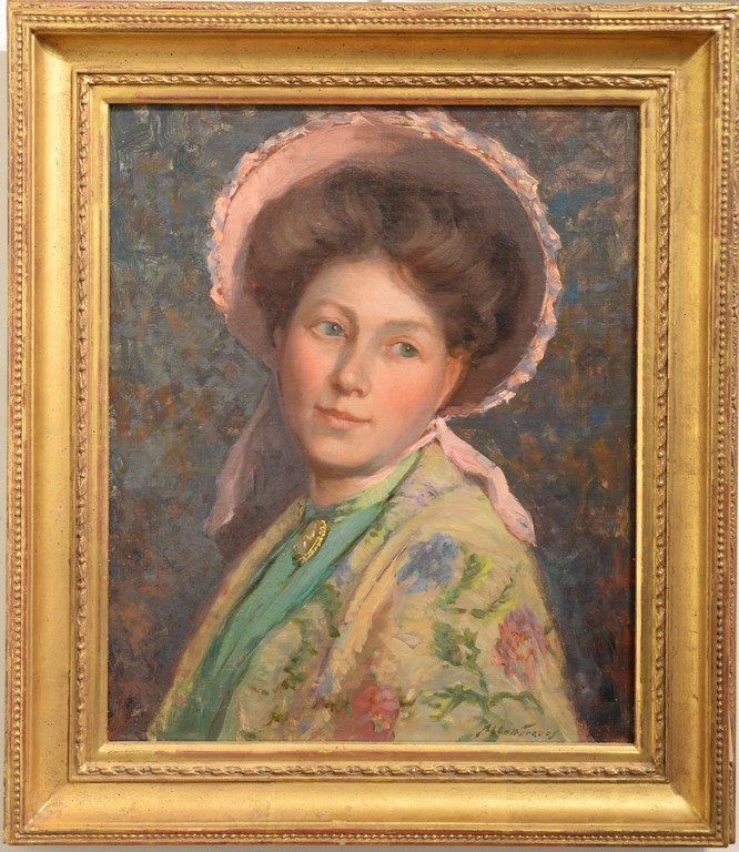 Abbot Fuller Graves 1859-1936 Portrait Bust of a Young Woman having flower print on her coat in pastel colors oil on canvas signed lower right: Abbott Graves relined 18 x 15