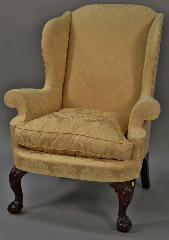 Custom hand made Chippendale style upholstered wing chair with newer gold silk upholstery all set on carved cabriole legs ending in ball and claw feet like new condition.