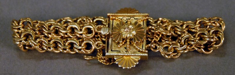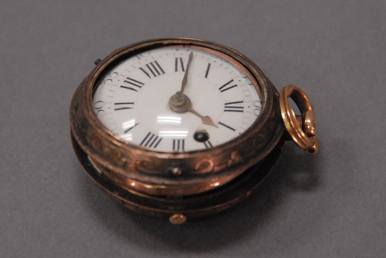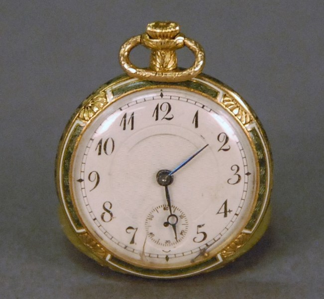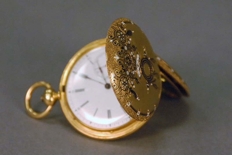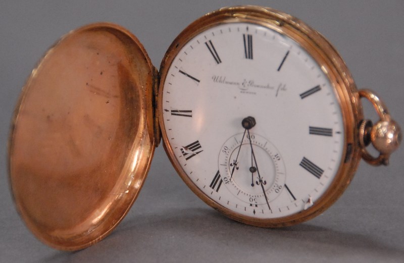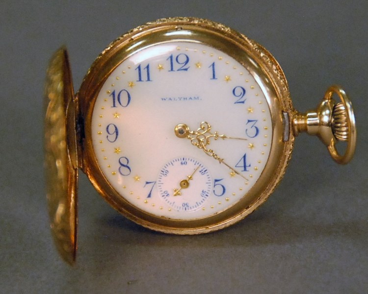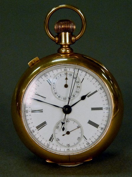 14K gold pocket watch with stopwatch, chronometer, and two small dials, inscribed on back From the Salesmen of The Canadian Branch Vacuum Oil Company December 25th 1898. dia. 2in.