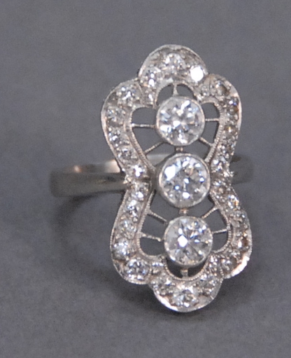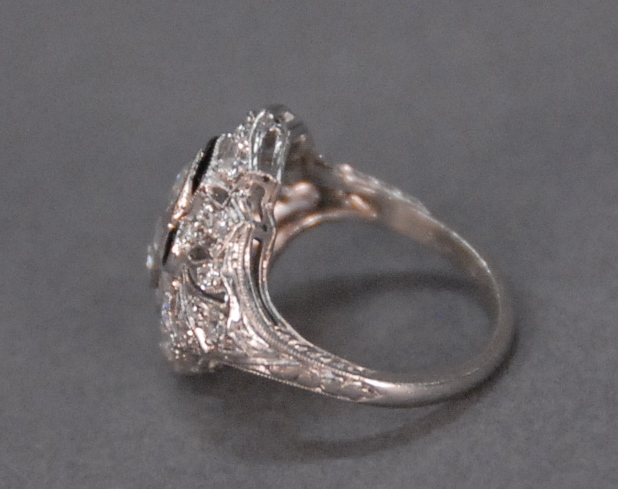 Platinum filigree diamond, and onyx ring set with one 1 marquee cut diamond in center measuring 9.8 x 5.1 x 2.75mm and weighs an approximate carat weight of 1.35 by formula, diamond has G-H color and SI1 clarity, mounting is set with twenty-one 21 diamonds, one diamond missing one section of onyx missing. size 2 1/4