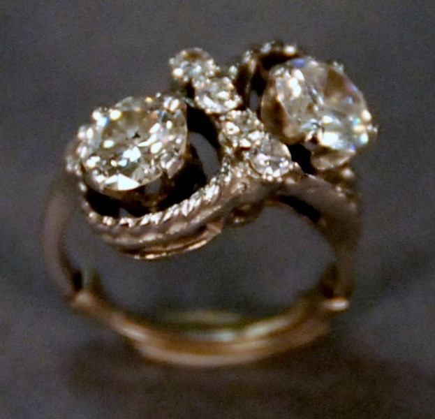 14K gold and diamond two stone ring set with one diamond, approximately 1.05 cts and one matching cubic zirconia, having four small diamonds between. size 5