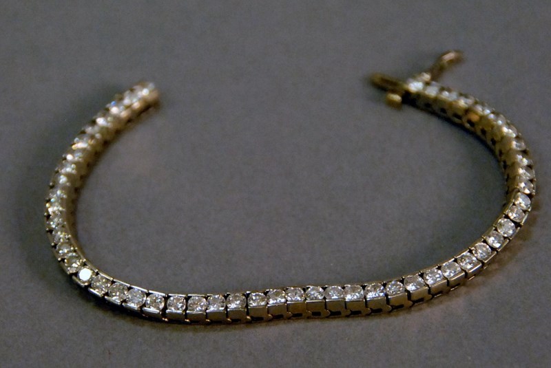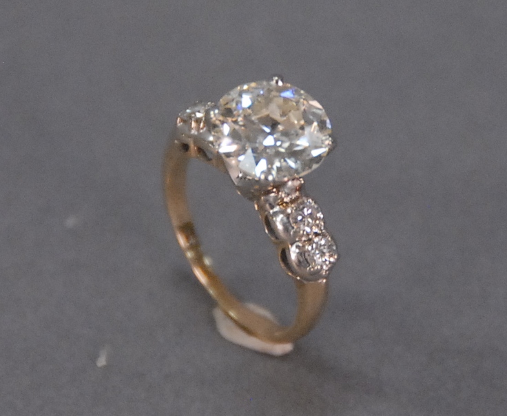 14K diamond engagement ring having one round brilliant cut diamond in the center measuring 9.2 x 9.28 x 5.12mm with approximate carat weight of 2.65 by formula, diamond has L-M color and VS1 clarity, there are two 2 round brilliant cut diamonds on each side weighing approximately .25 carats by formula, these diamonds average I color, SI clarity and have chips on the girdle edge. size 5