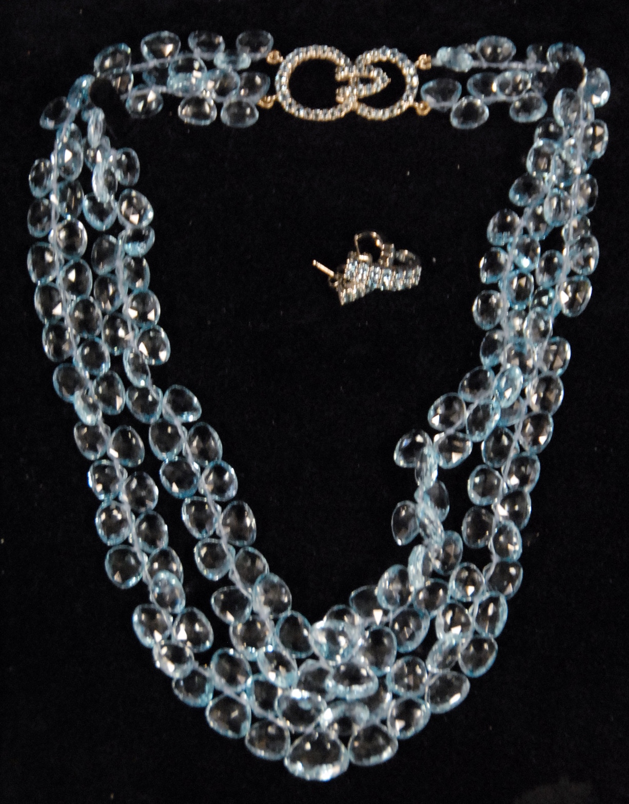 Blue topaz graduated double strand necklace featuring 168 graduated briolette cut topazes with an 18K white gold clasp having 54 round cut topazes along with 18K white gold and blue topazes hoop earrings having 28 total topazes. Provenance: Sotheby’s Salon Prive June 2005