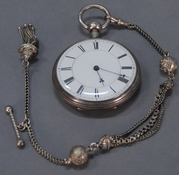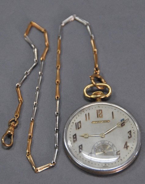 Platinum and 18K gold Touchon & Co. Swiss pocket watch with open face and two color platinum and 14K gold chain, watch face marked Tiffany & Co. in Tiffany box. back of watch weight: 16.6 grams chain weight: 16 grams total watch weight: 54.4 grams