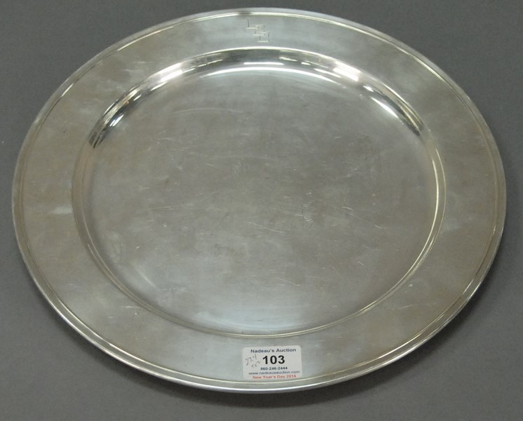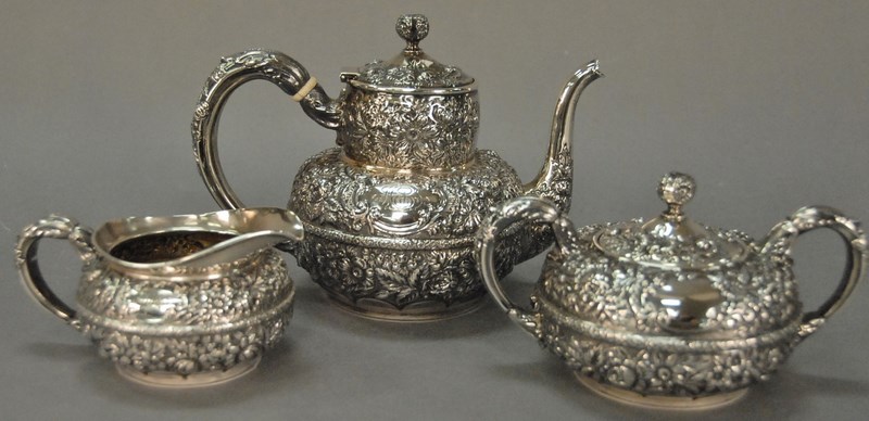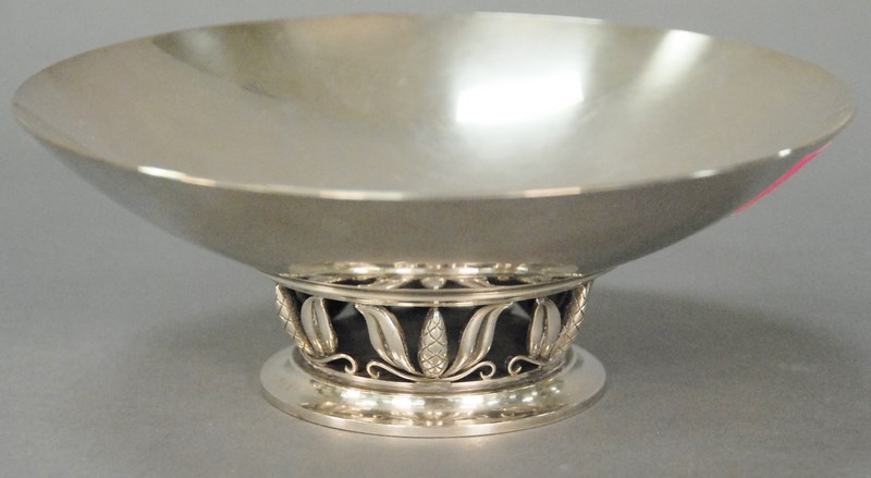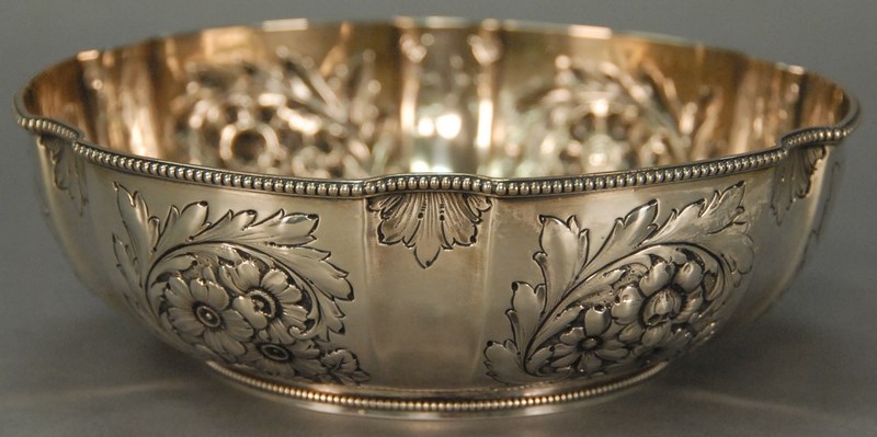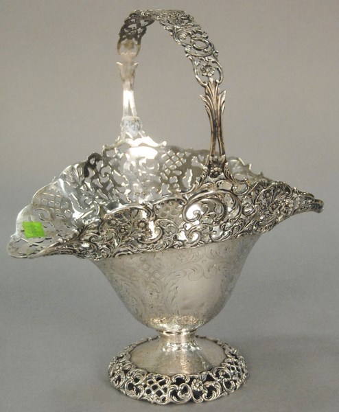 J. E. Caldwell sterling silver basket with reticulated swing handle, reticulated flared top on round open work foot and allover chased body no monogram. ht. 13in. 34.4 t oz.
