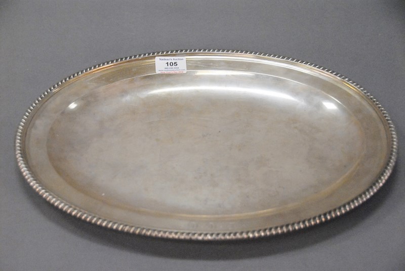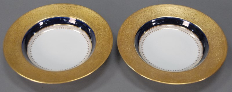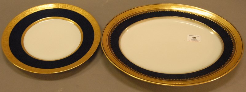 Eighteen piece lot to include set of seventeen Limoges dinner plates with raised gold borders trimmed in cobalt plus one near matching platter. dia. 10 3/4in.
