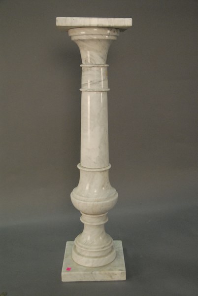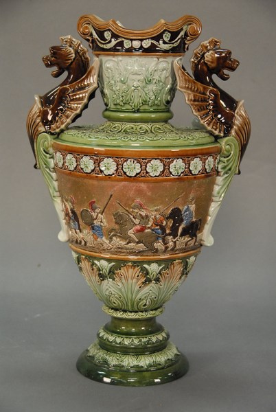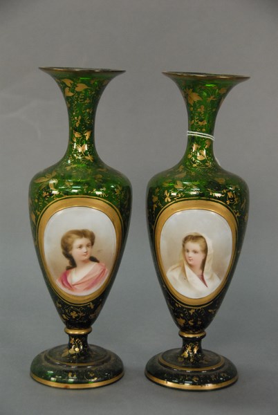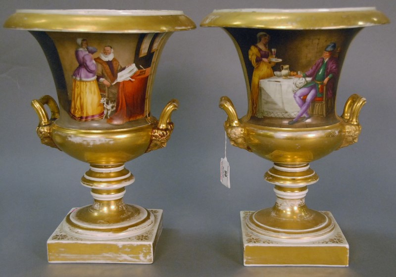 Pair of French porcelain urns, each with two hand painted panels and handles on turned revolving pedestal on square base, gilt decorated, probably early to mid 19th century one handle cracked. ht. 13 1/4in.