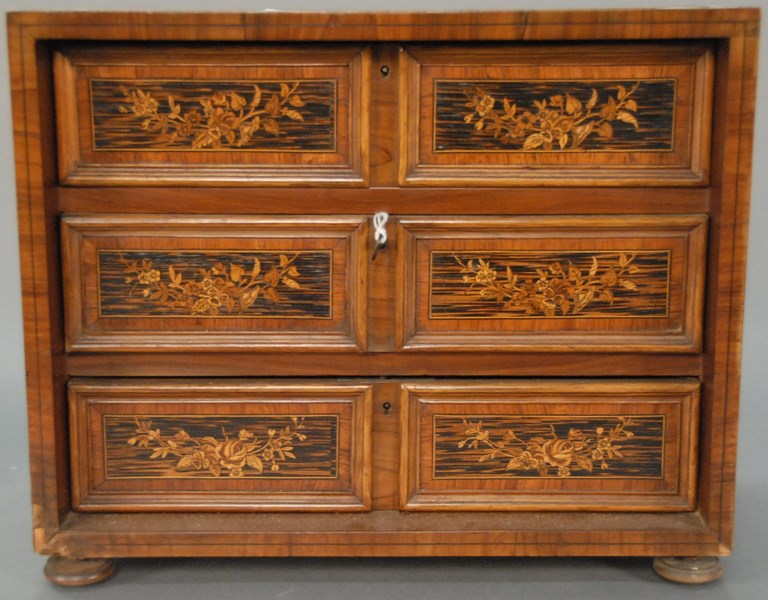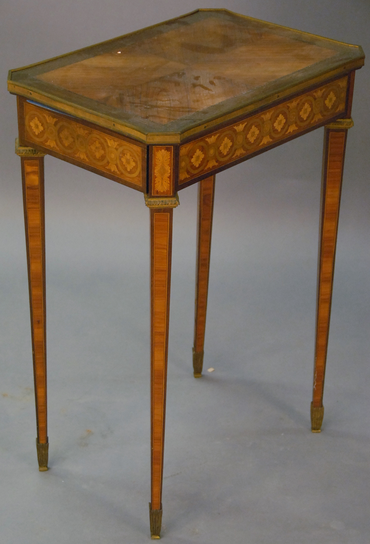 Louis XVI style table with brass trimmed inlaid top over floral inlaid sides, all set on square tapered inlaid legs ending in brass caps, one drawer in end, tag on bottom marked Made in France for B. Altman & Co. N.Y. ht. 29in. top: 14 x 20