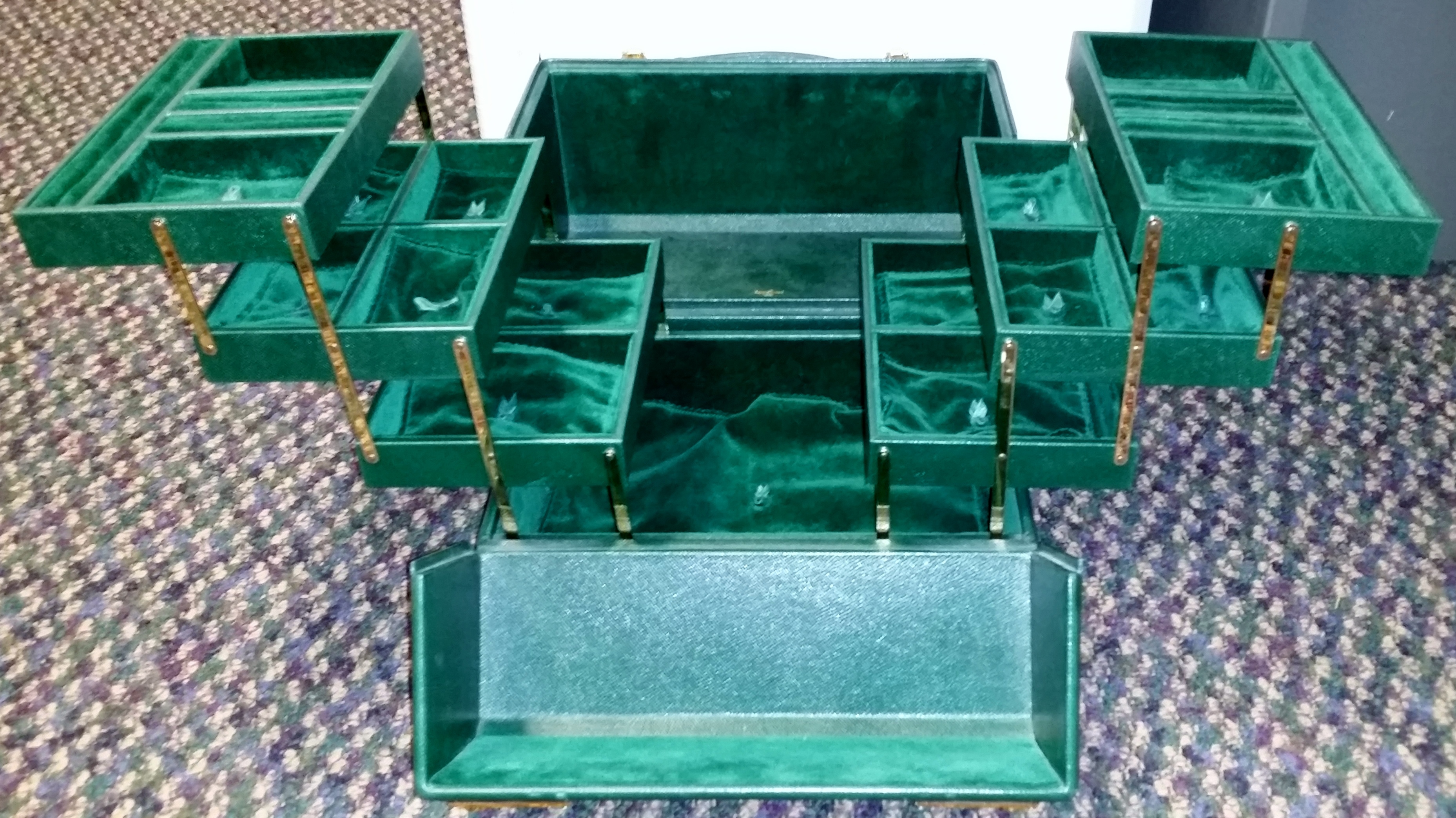 Vintage Asprey green jewelry box having fold-out compartments with removable velour pads, gold double lock, and accents, marked Asprey & Garrard light scuff marks and one minor tear. ht. 7 1/2in. lg. 12 1/2in. dp. 9 3/4in.
