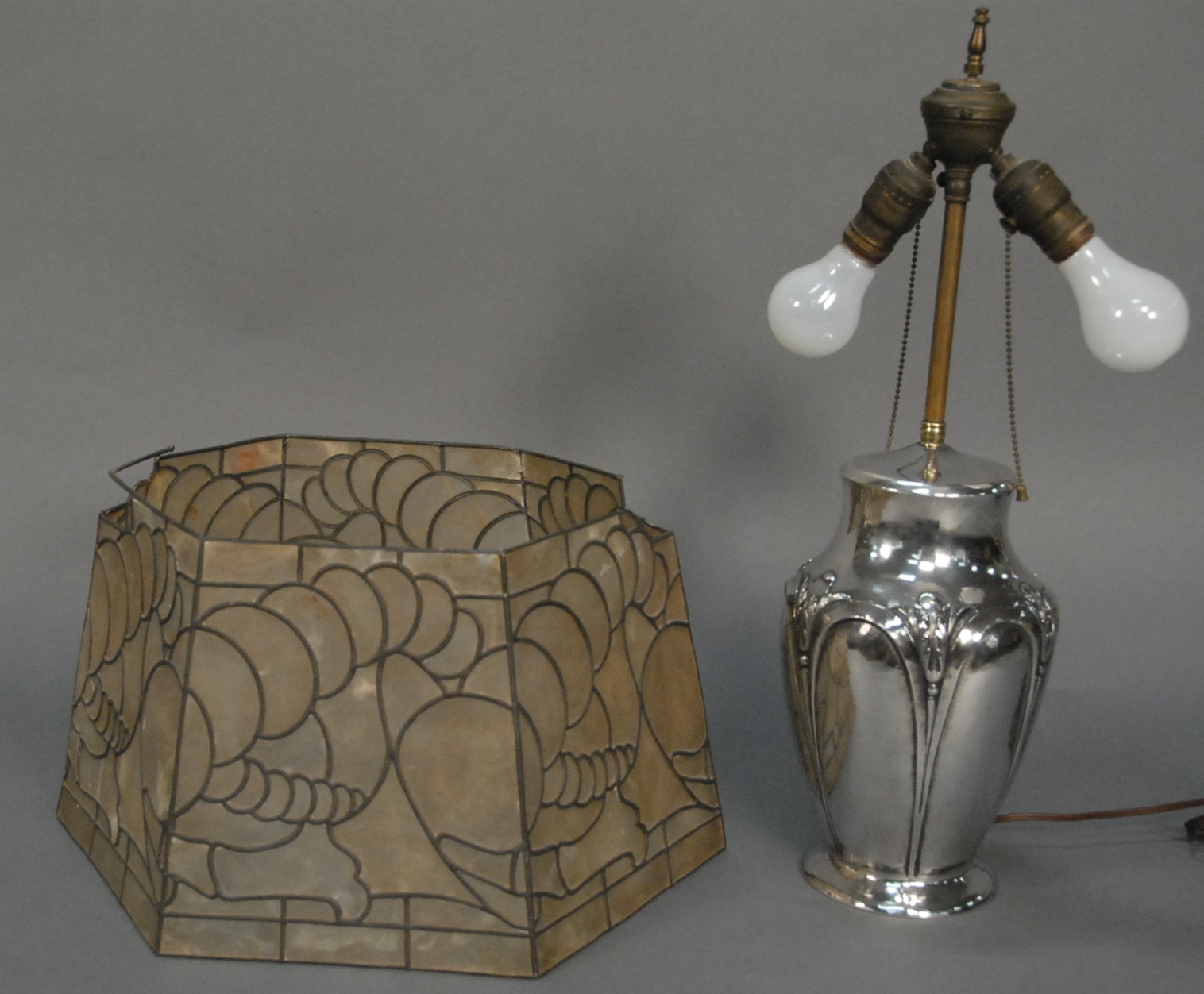 Clemens Friedell 1872-1973 sterling silver hand hammered table lamp in arts & crafts style, signed on base Friedell Pasadena Sterling with original leaded shade top of shade with two missing parts. ht. of vase 11 1/2in.